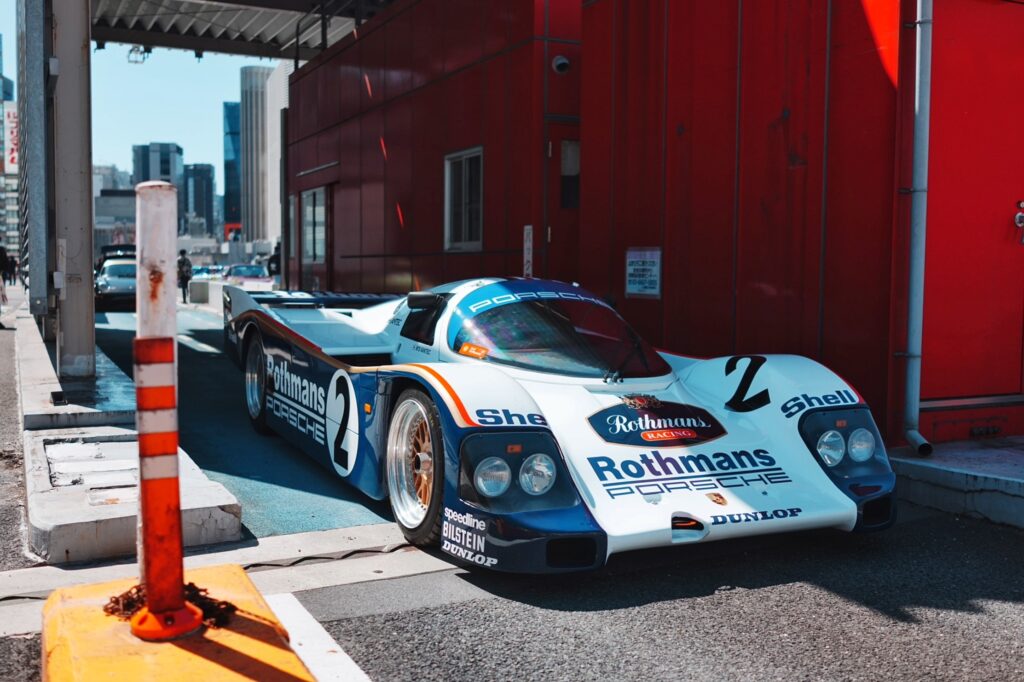 to the quintet of Group C Porsche 956/962 race cars, two wearing the iconic black and red Advan colors, one a 1982-1984 Le Mans replica wearing the Rothmans colors, another one in plain white and the last one in blue and white Trust / Iseki livery driven by Vern Schuppan which raced at the All Japan Sports Prototype Champsionship. Epic stuff.