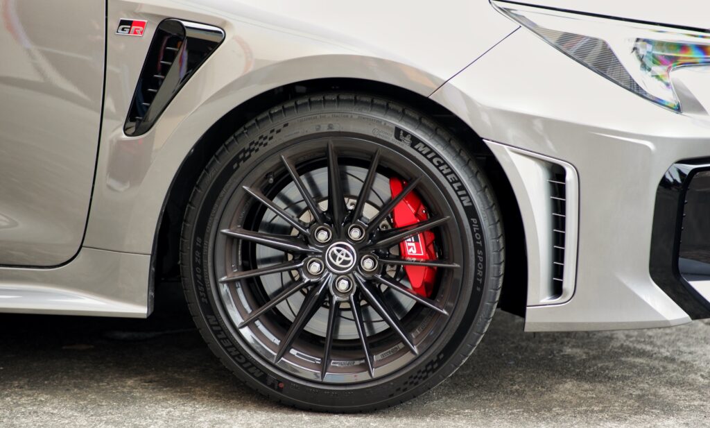 The OEM Michelin Pilot Sport 5 tires that wrap around the factory 18×8.5 wheels provide excellent grip, predictable break-away feel. But imagine the GR Corolla with more aggressive tires (200 TW tires or lower), a more aggressive alignment setting for circuit use and firmer suspension and the Corolla will be a real monster on road and track!