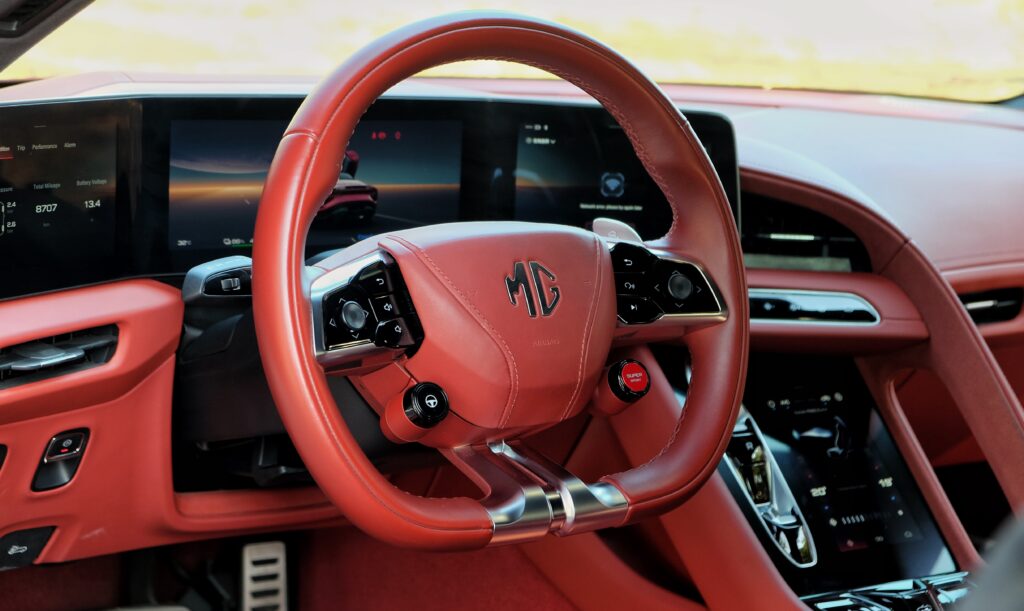 The flat-bottom three-spoke steering wheel reaches out to you and there’s a plethora of buttons for the various multi-info displays, the driving aids and the infotainment system itself. So far so good, the MG Cyberster feels promising.
