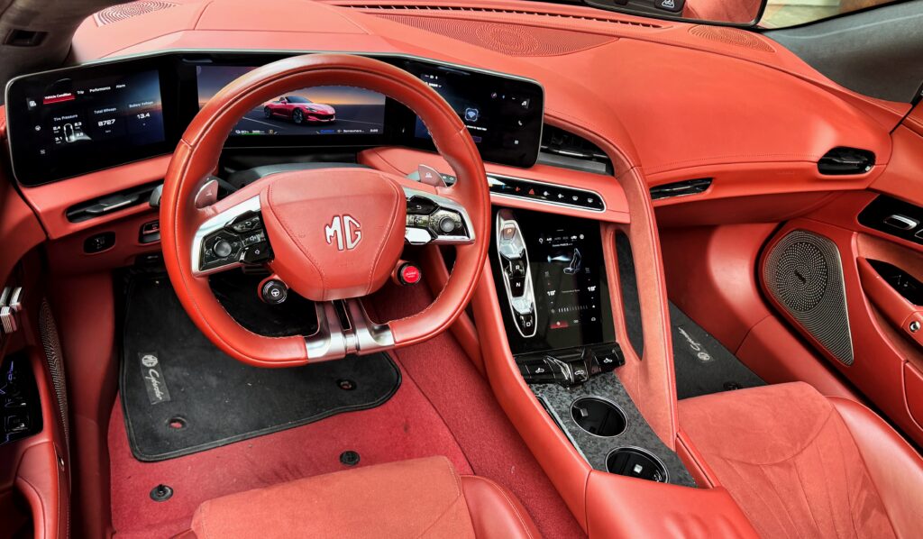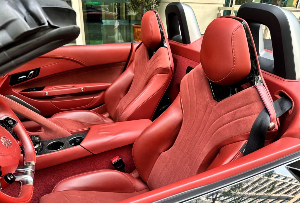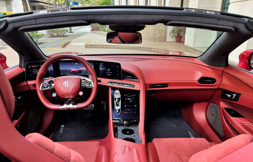 Swing the doors up electronically (either via key fob or buttons on the door), slide in and the interior is surprisingly very spacious. The Cyberster is a rather large car, more Mercedes SL than BMW Z. There’s a good amount of cubby holes and storage space inside for your personal effects, and the 250 liter trunk is adequate for a small weekend bag.