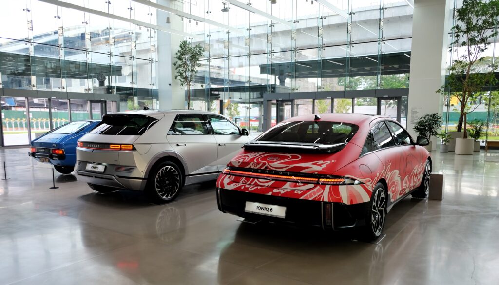 There are three cars that greet you immediately: the Hyundai Pony, the brand’s first ever mass-produced car and beside it the Ioniq 5 which pays homage to the Pony through its four square LED DRL’s and headlamps. Then there is an Ioniq 6 which features a unique livery designed by students from the La Salle College of Arts who won an art competition sponsored by HMGCIS. Its theme, The Dragon of the East, features warm vibrant colors that exemplify a very much Asian feel and resonates with Singapore.