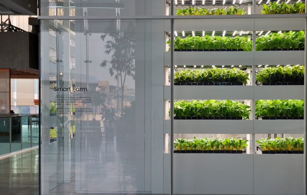 Then there’s also Hyundai’s Smart Farm. It’s a fully automated, state-of-the-art hydroponics farm that grows organic greens. It is a 2-storey, fully automated, high-tech indoor vertical farm that utilizes robotics and artificial intelligence to grow up to nine types of leafy greens (such as mustard greens and romaine) without pesticides.