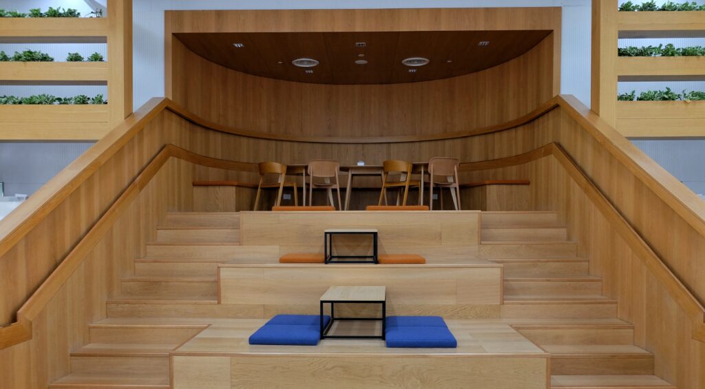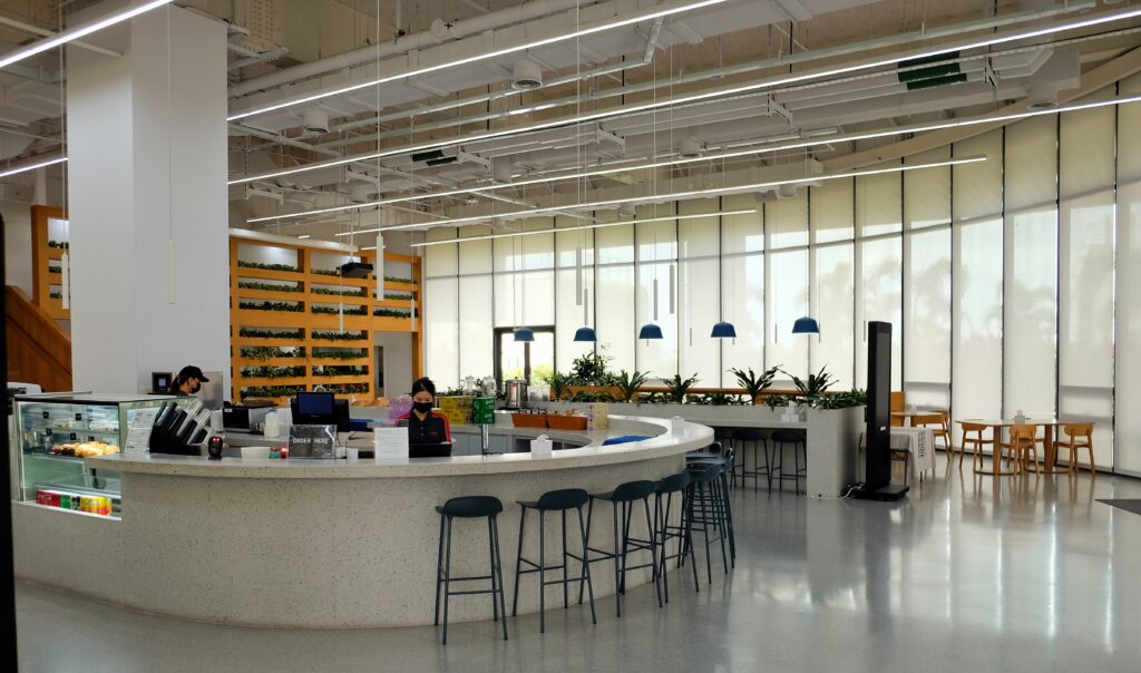 The fifth floor also houses campus-like offices and a cafeteria. There is also a lush outdoor park-style lounging areas and solar panels to offset energy consumption from renewable sources.